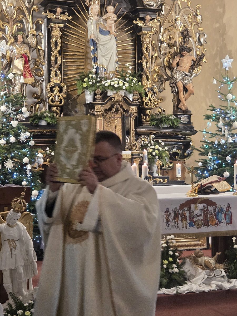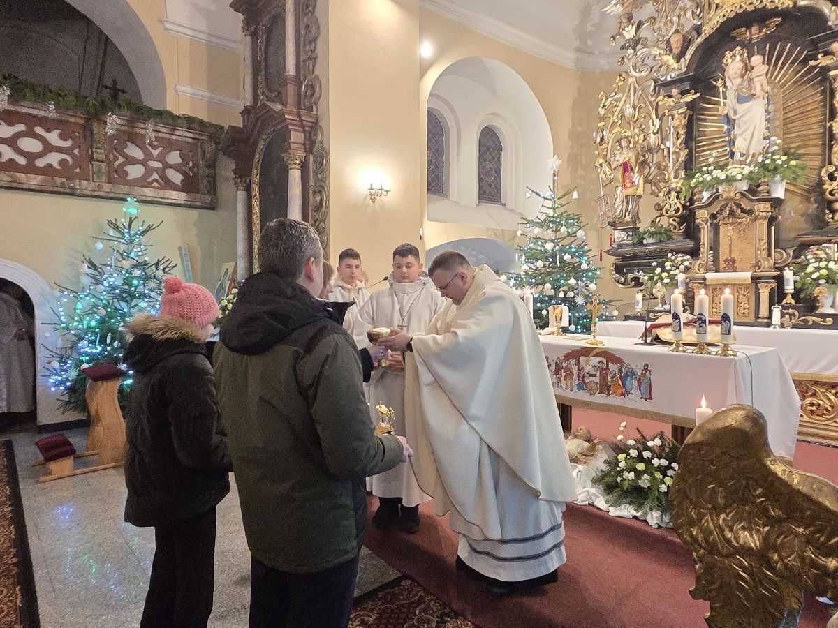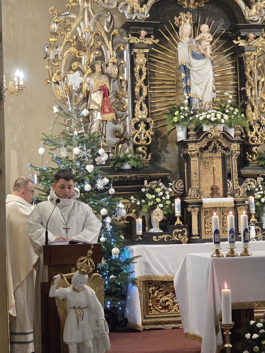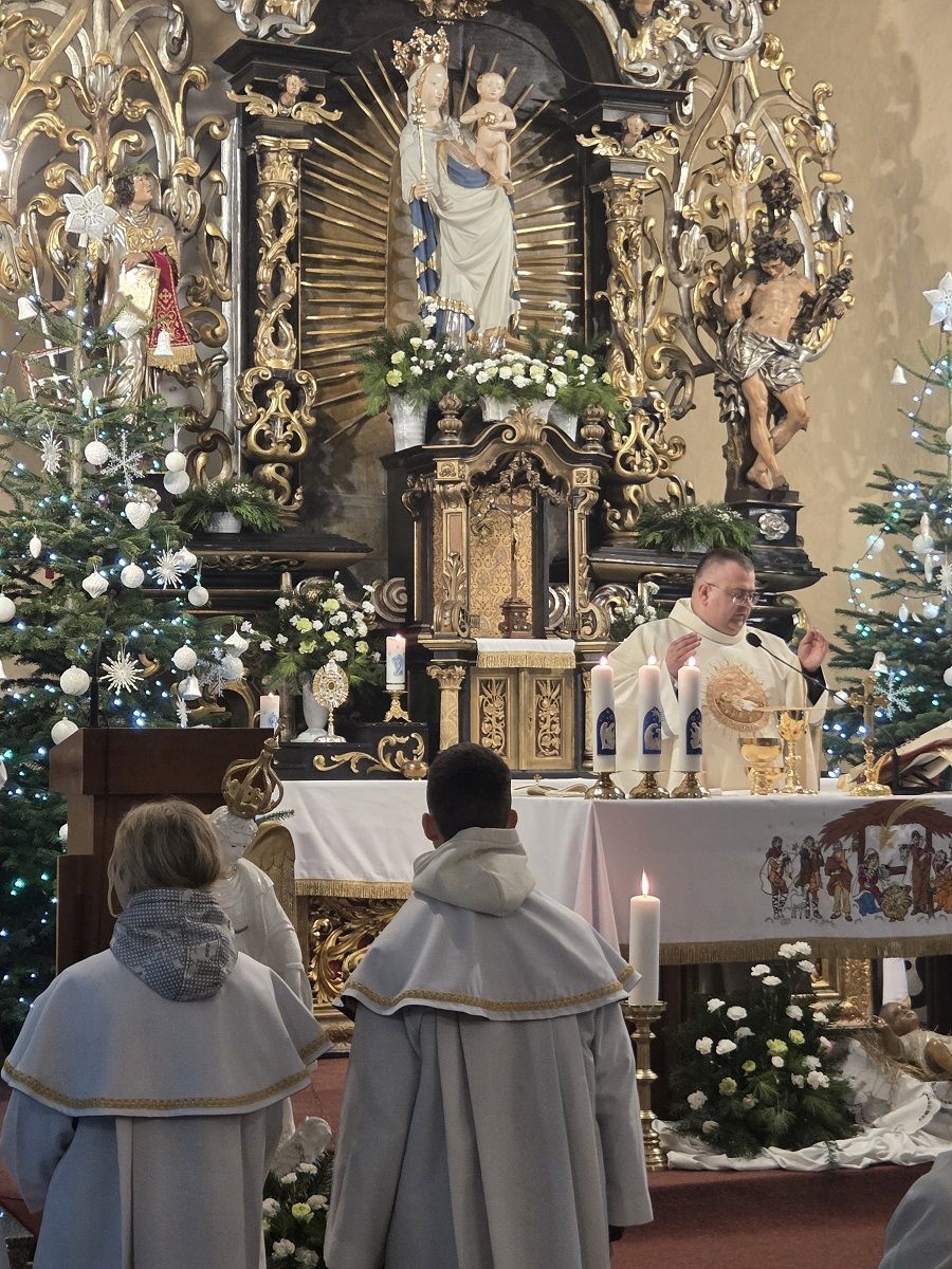 W pięknej homilii Ks. Proboszcz przypomniał wiernym, że: "Rodząc się jako Dziecko - Bóg stał się Emmanuelem - Bogiem z nami, od którego nie oddziela nas żaden dystans wysokości i oddalenia. Bóg dał człowiekowi bezpośredni dostęp do dziecięcego serca, przez co stał się tak bliski, dzięki czemu można mówić do Niego "TY". Boże Narodzenie to przyjście Mesjasza, który odnawia świat i jedna ludzi z Bogiem. Jezus Chrystus, Bóg-Człowiek, zjednoczył ziemię i niebo, nierozerwalnie pojednał człowieka z Bogiem, sprawiając, że człowiek stał się dzieckiem Boga."